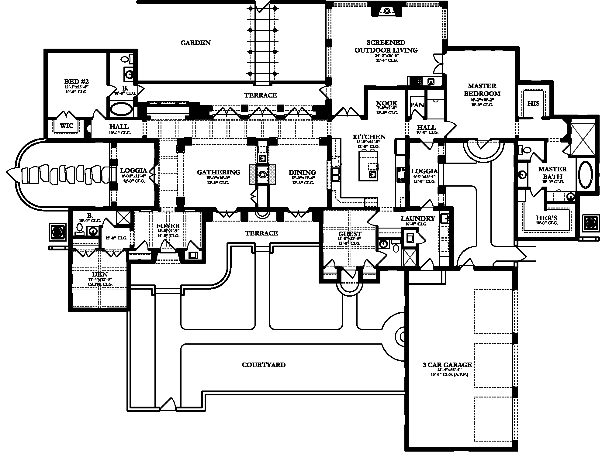 Enjoy supreme indoor/outdoor connections in this unique one-story home. Standout features include the large screen porch (easily accessed by the master suite), the two-sided fireplace that warms the gathering and dining rooms, and the two terrific bedroom suites available to guests. Multiple loggias and terraces offer up almost unlimited opportunities to relax outside. A den gives you quiet space for work or hobbies. Don’t miss the huge master shower or the kitchen’s central island.
