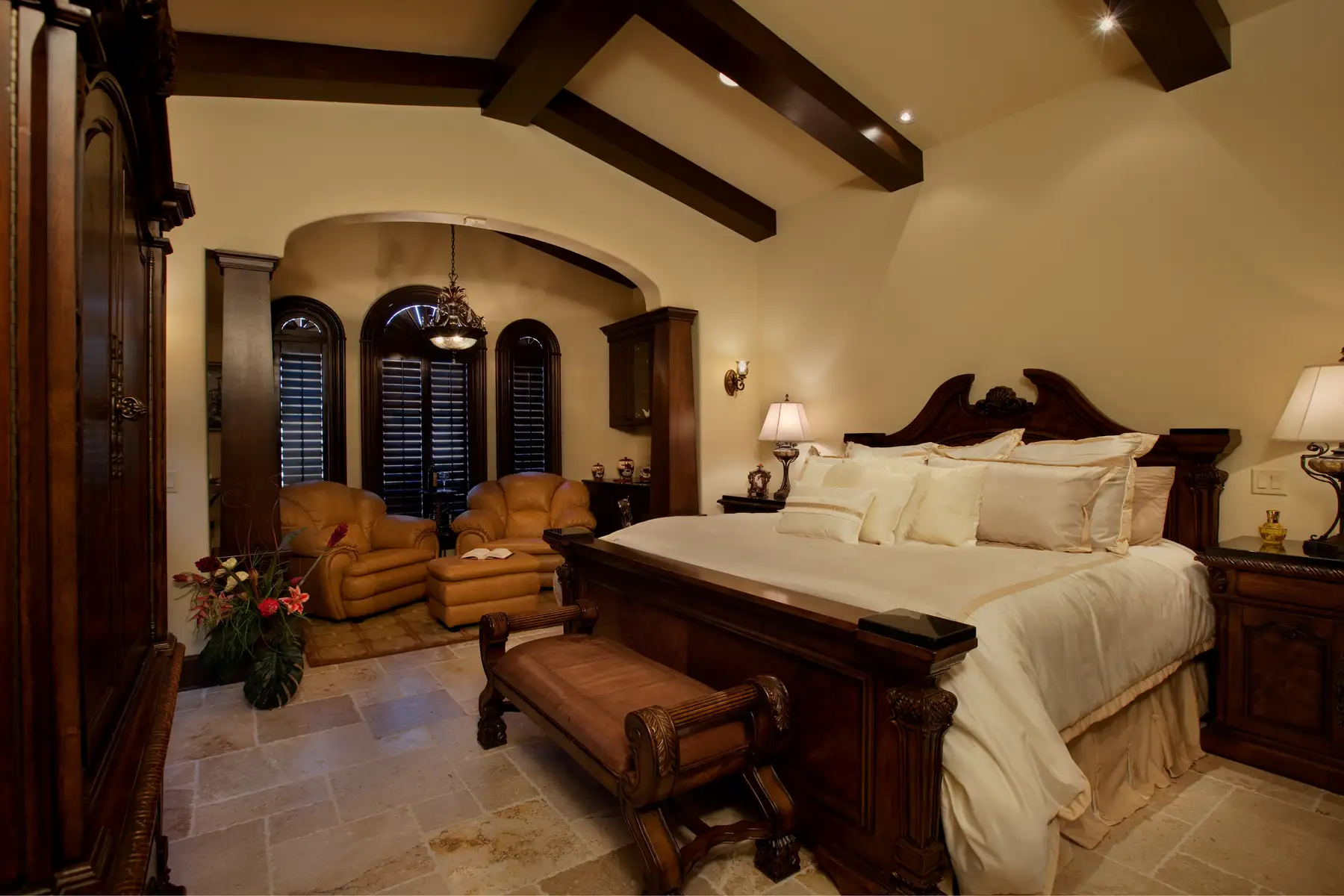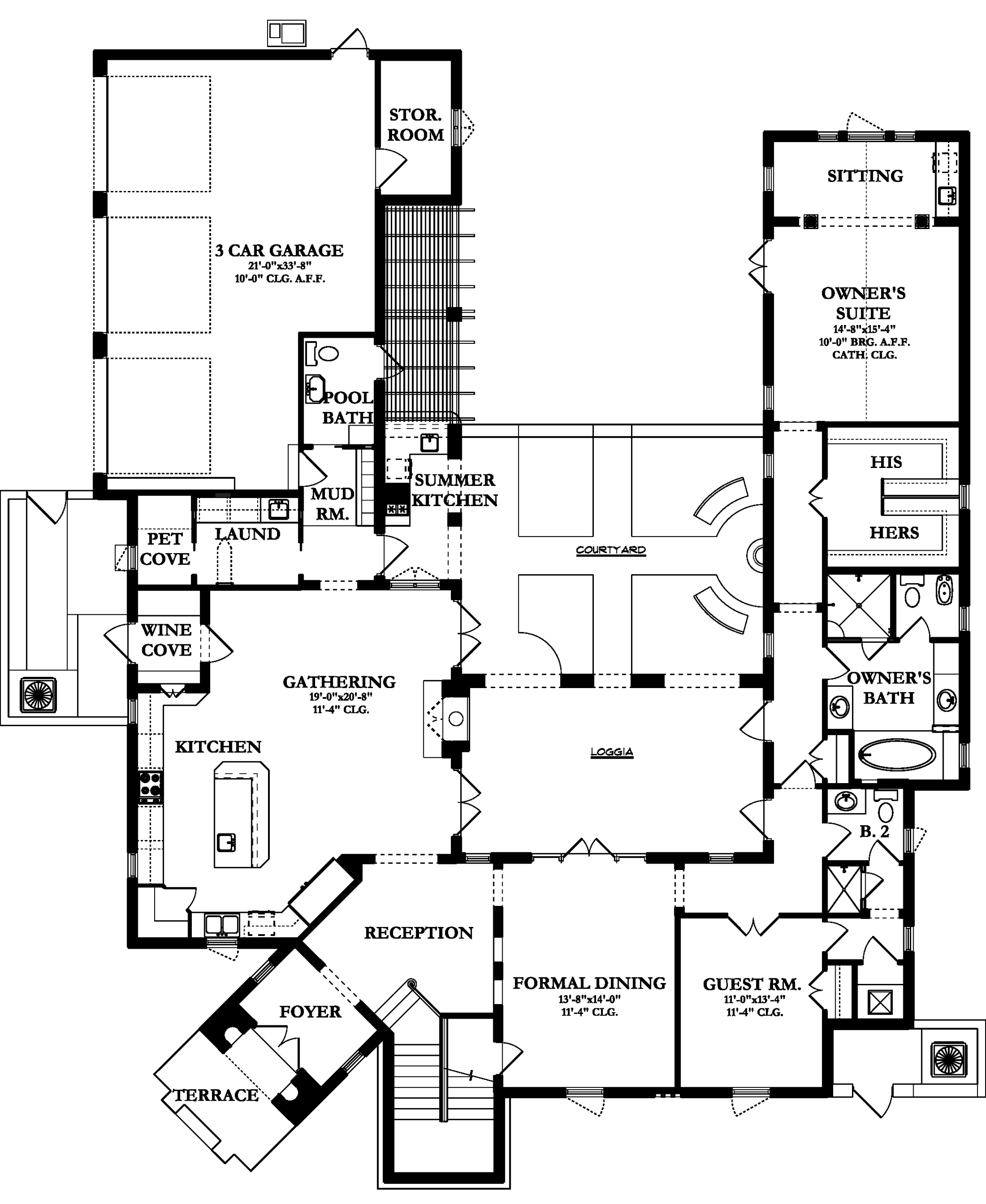 The Private Courtyard with its benches offers plenty of sitting area to enjoy the water fountain, or you can rest under the trellis located by the summer kitchen in the same area. First floor has a Guest Bedroom that can be used as an Office. There is also plenty of storage space under the “U” shape staircase and a storage room in the garage. Also our pet friendly plan, offering an Air Conditioning Pet Cove inside the house and a private pet run outside.