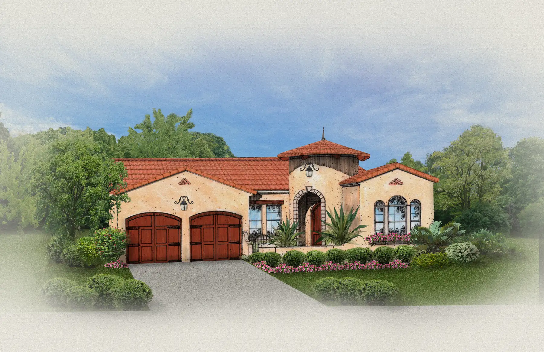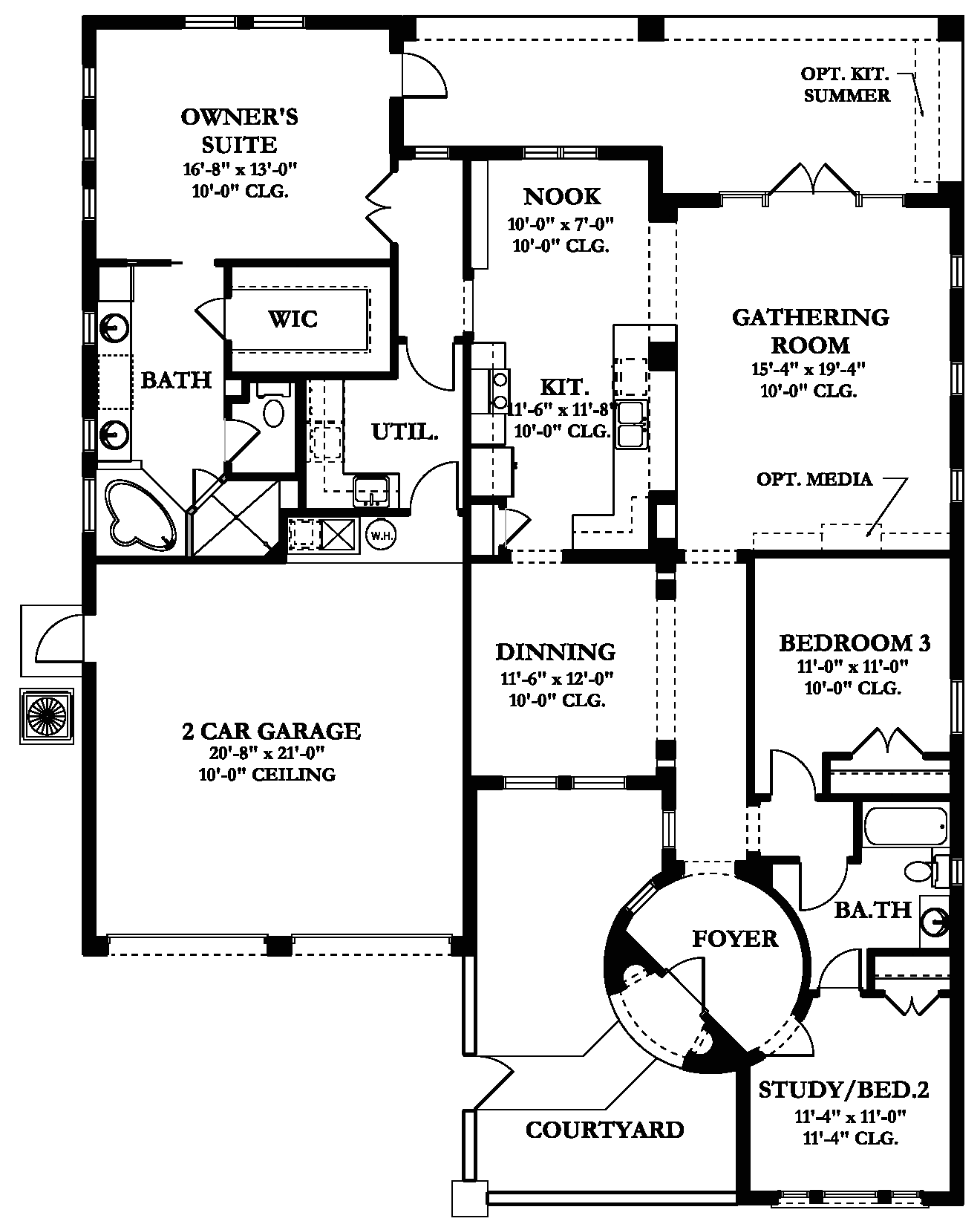 Dramatic style adorns practical spaces in this great new plan. The scene-stealing turret creates quite an entrance. Inside, head right to the study/bedroom 2, or left to arrive at the heart of the house. The spacious gathering room is served by the kitchen’s snack bar, and also opens to the back porch. A private foyer buffers the master suite from public view. Enjoy the tall 10′, 11′-4″ and 12′ ceilings and deep recessed front windows.